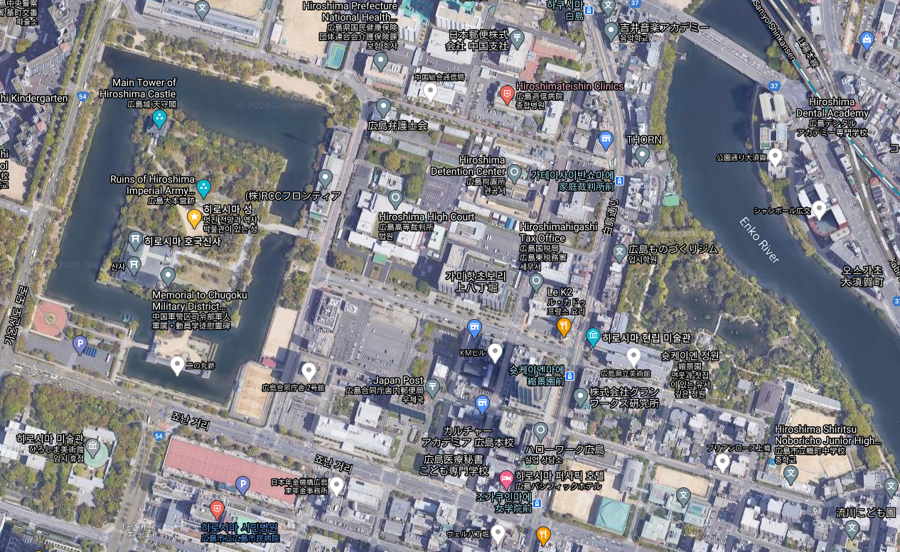 위 지도에서 보시는 바와 같이 히로시마성과 슛케이엔은 멀지 않은 곳에 있습니다.