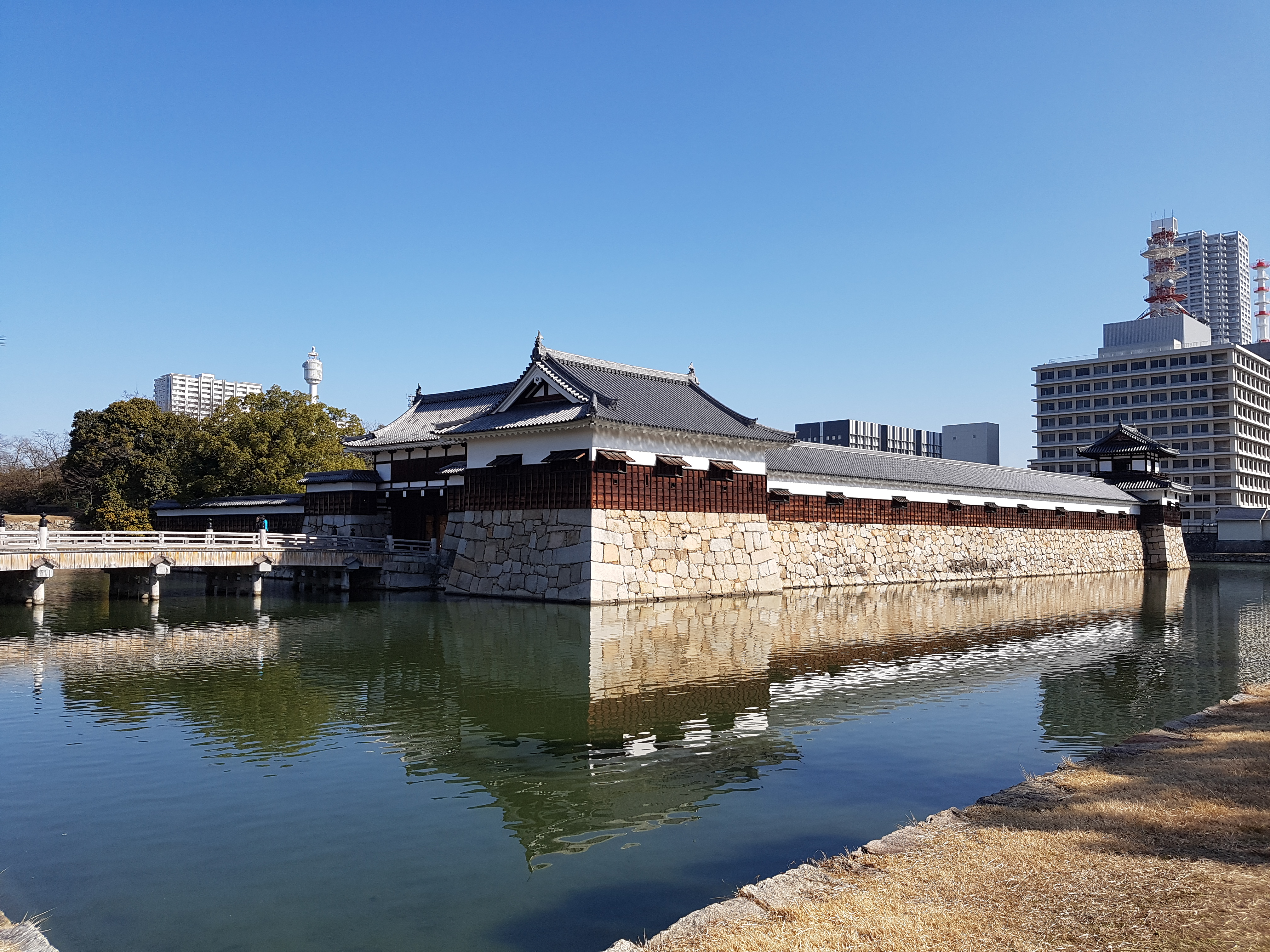 어떠신가요? 일본 여행 많이 다니셨던 분들은 느끼실지 모르겠습니다만, 성의 외벽이 나무 재질로 되어 있는 게 색다른 듯합니다. 대부분의 성들은 그냥 석재를 이용해서 좀 딱딱한 느낌이지만 이 곳의 성은 집 같은 느낌이 듭니다. 또 한 가지 성을 감싸고 있는 해자에 어마 무시한 몸값을 자랑하는 잉어를 키우고 있습니다. 아마 히로시마를 상징하는 동물이 잉어라서 그런 듯도 하고요.