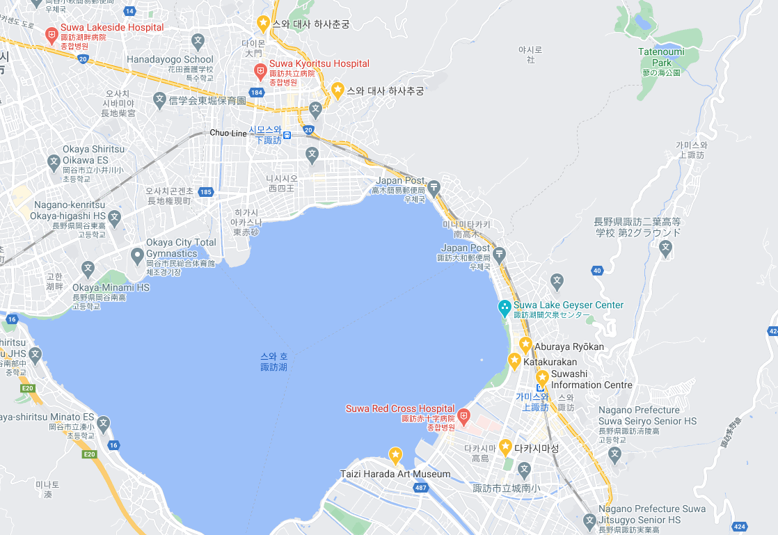 나가노는 산으로 유명합니다. 동계올림픽으로 많은 분들에게 익숙한 동네일텐데요. 오늘의 온천로드는 산이 아니라 호수, 나가노현 스와호 주변의 카미스와(上諏訪)입니다. 이곳은 신주쿠에서 특급(아즈사) 열차로 2시간 10분 정도가 걸리는 카미스와역(上諏訪駅) 주변의 동네인데요. 1박 2일로 다녀오기 괜찮은 마을입니다.