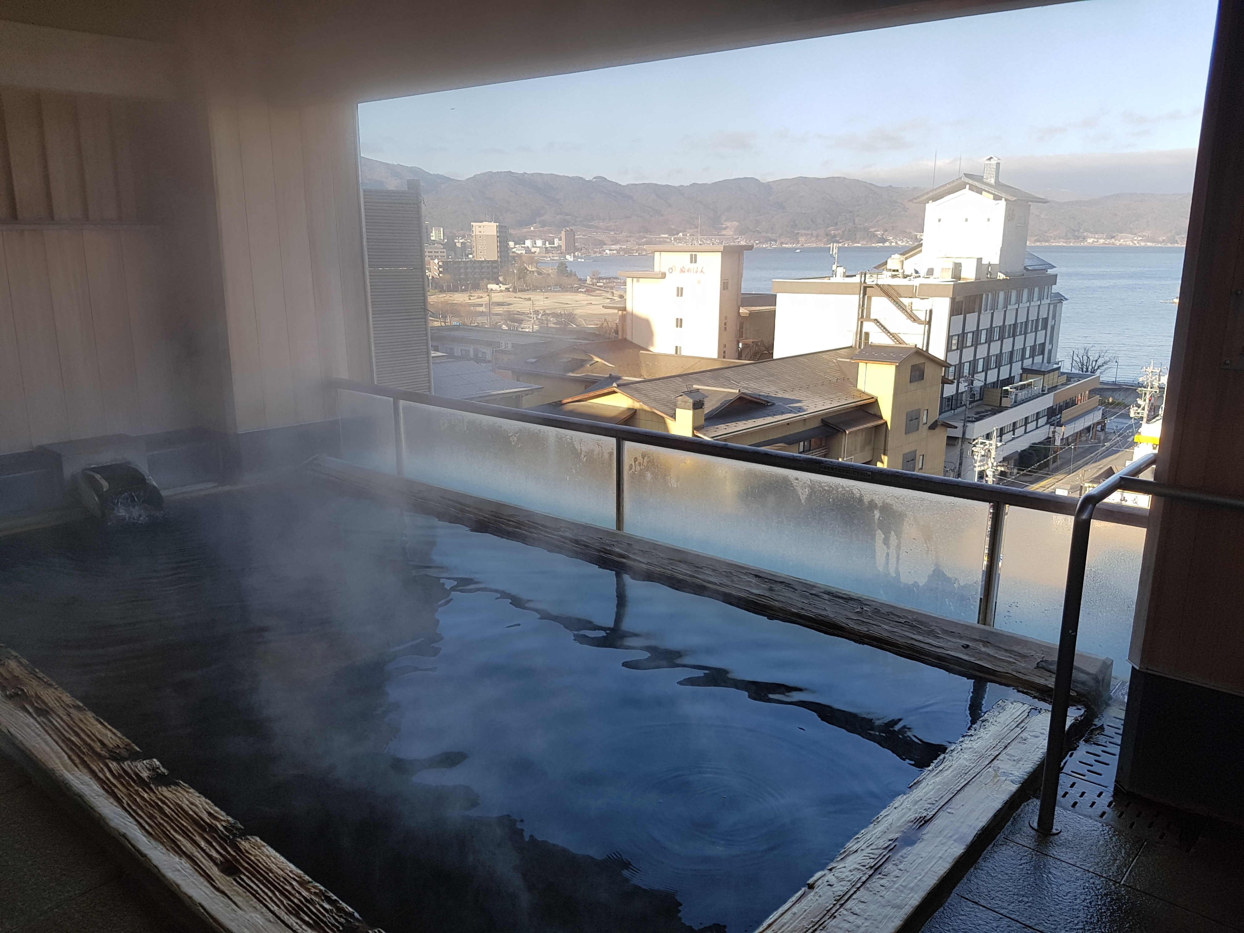 전망 노천탕의 모습입니다. 물도 깨끗하고 탁트인 호수를 바라보며 온천욕을 하고 있으면 기분이 끝내줍니다. 1층에 대욕장이 별도로 있는데 그곳도 깔끔하고 괜찮았지만, 역시 온천은 찬바람 맞으며 하는 노천욕이 최고죠. 다만, 온천물이 그렇게 좋지는 않았습니다. 저는 개인적으로 좀 미끈미끈하고 유황냄새가 폴폴 나는 본격적이고 노골적인(?) 온천을 좀 더 선호하는 것 같습니다.