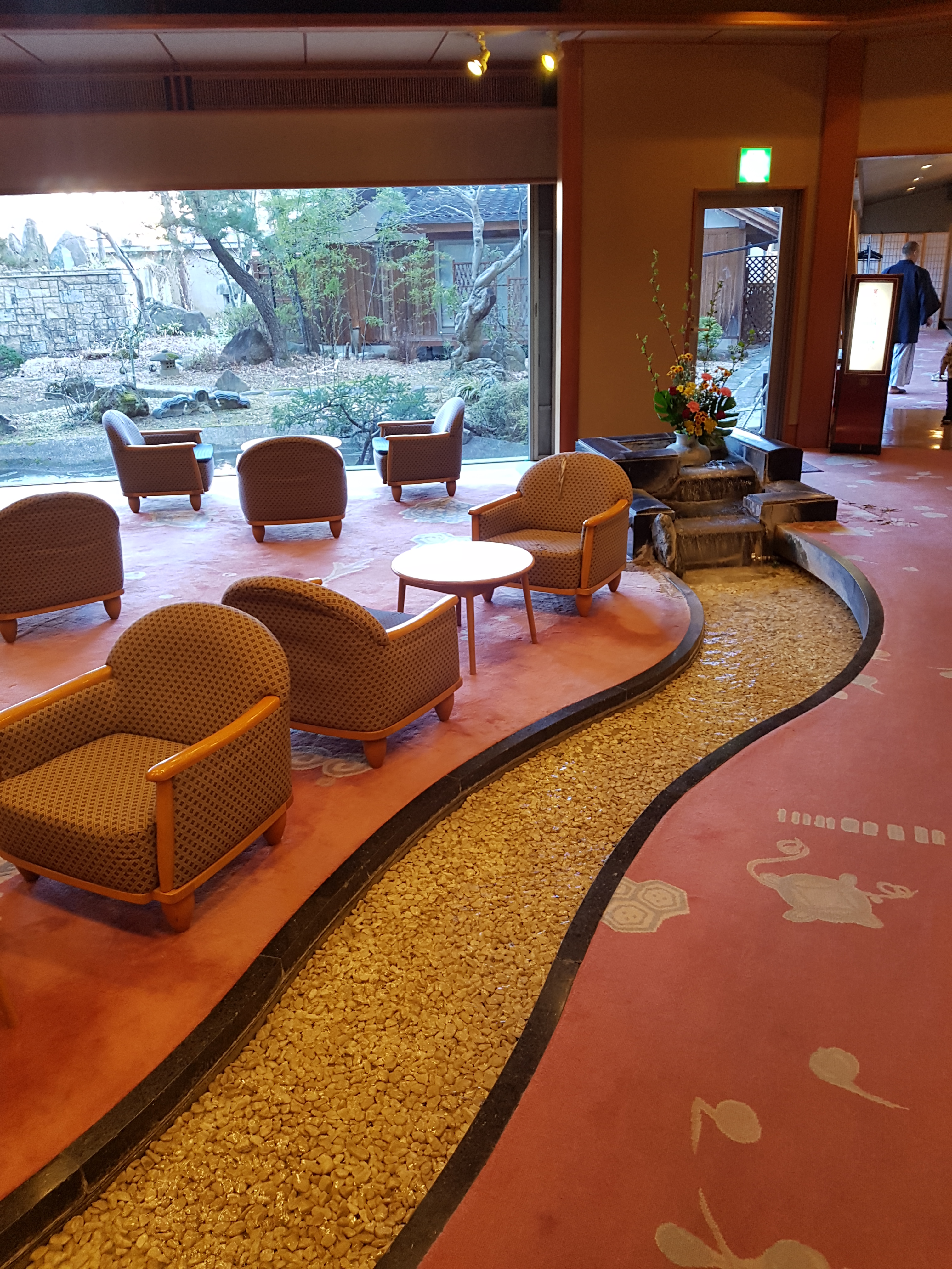 료칸 1층에 위치한 휴식공간입니다. 발밑에 흐르는 물소리를 들으며 차 한잔 하고 있으니, 정말 주중의 스트레스가 까마득한 옛날 일 같고 아무 것도 아닌 것처럼 느껴집니다. 창밖으로 보이는 풍경도 꽤나 근사합니다.